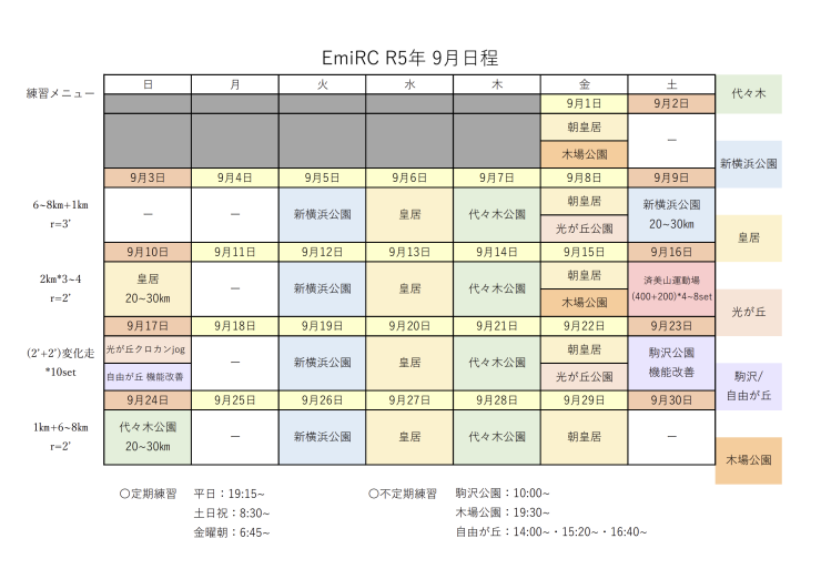 Emi練 東京(代々木公園)では、毎週木曜日と日曜日(月に2~3回)に定期練習会を開催し、皆さんにコミュニティの場を提供します!