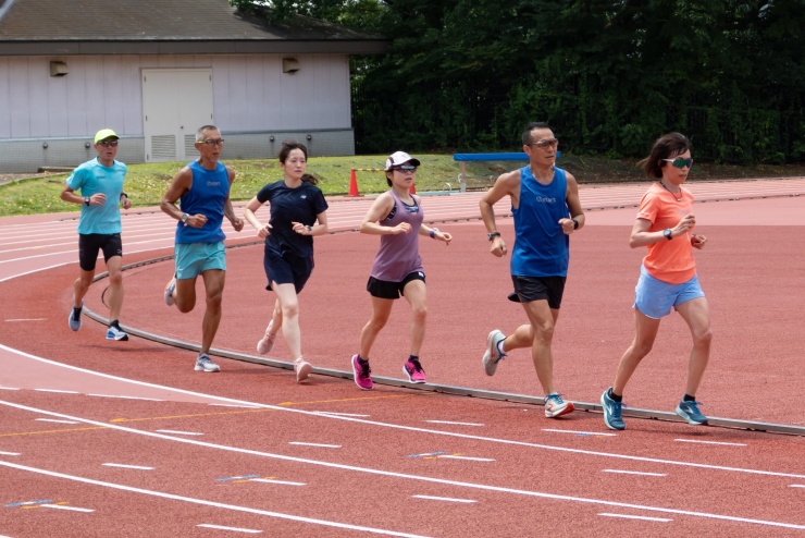 1000mのインターバル(レペティション)をタイム別に走ります。同じペースの参加者同士でペースメイクを行います。