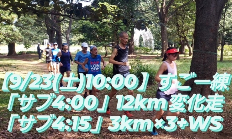 【9/23(土)10:00】すごー練「サブ4:00」12km変化走「サブ4:15」3km×3+WS 受付終了