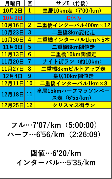 10〜12月毎週月曜日開催のフルマラソン5時間切り(サブ5)を目指す方向けの練習会です。