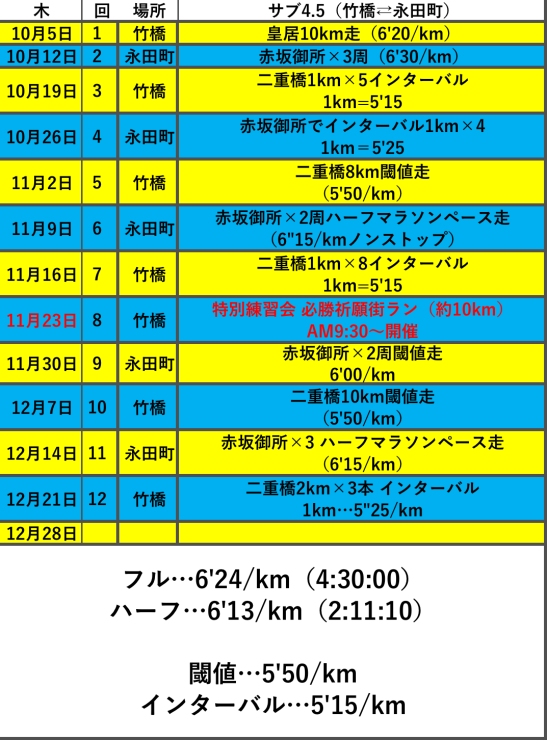 10〜12月毎週木曜日開催のフルマラソン4時間30分切り(サブ4.5)を目指す方向けの練習会です。