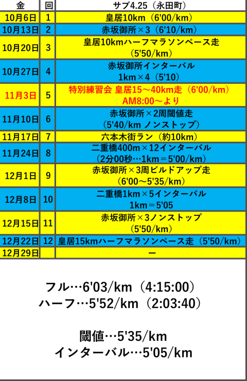 10〜12月毎週月曜日開催のフルマラソン4時間15分切り(サブ4.25)を目指す方向けの練習会です。