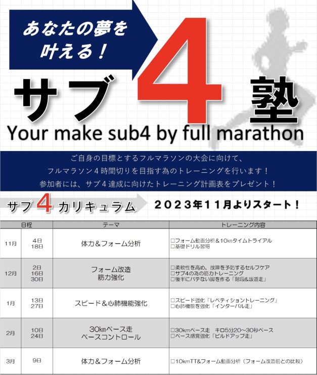 5ヵ月間のグループ制短期集中講座で、アナタの挑戦をサポート致します! サブ4を達成したい! なかなかベスト更新ができない 計画的にトレーニングをしたい! という方のご参加をお待ちしております! また、参加者にはサブ4達成に向けたトレーニング計画表をプレゼント! 指導カリキュラムに沿って、計画的に指導を進めていくので、練習内容に迷う必要もございません!