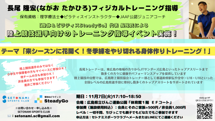 今回は「来シーズンに花開く!冬季練をやり切れる身体作りトレーニング!」をテーマに、長尾さんに当クラブ陸上競技コースの選手向けのトレーニングを行っていただきます