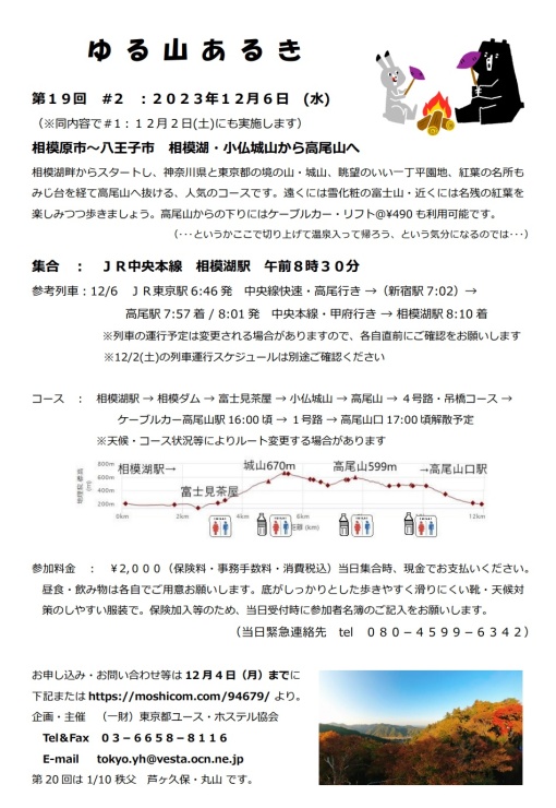 12月に入り相模湖から小仏城山までは紅葉もトレッキング客も一段落・・・という雰囲気でしたが、高尾山は外国人観光客も含め、まだまだ賑やか・華やかでした。いつもよりは少し長い距離の山あるき、リフトでの空中散歩は絶景でした。