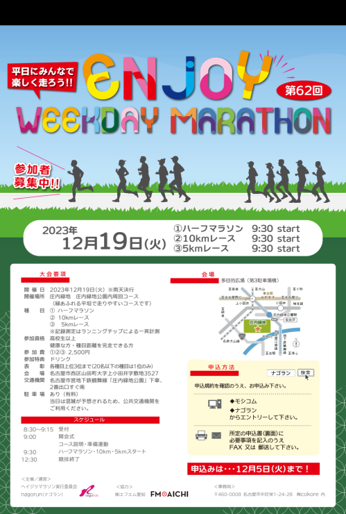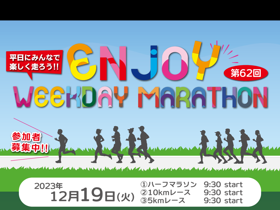 休日に参加するのが難しい方に、毎月平日に開催しています!種目…ハーフマラソン・10km・5km。リピート率が高く皆さまにご好評いただいています♪