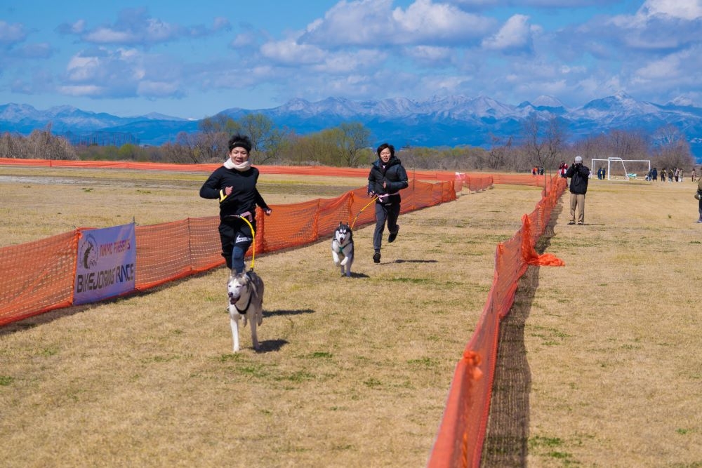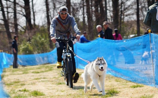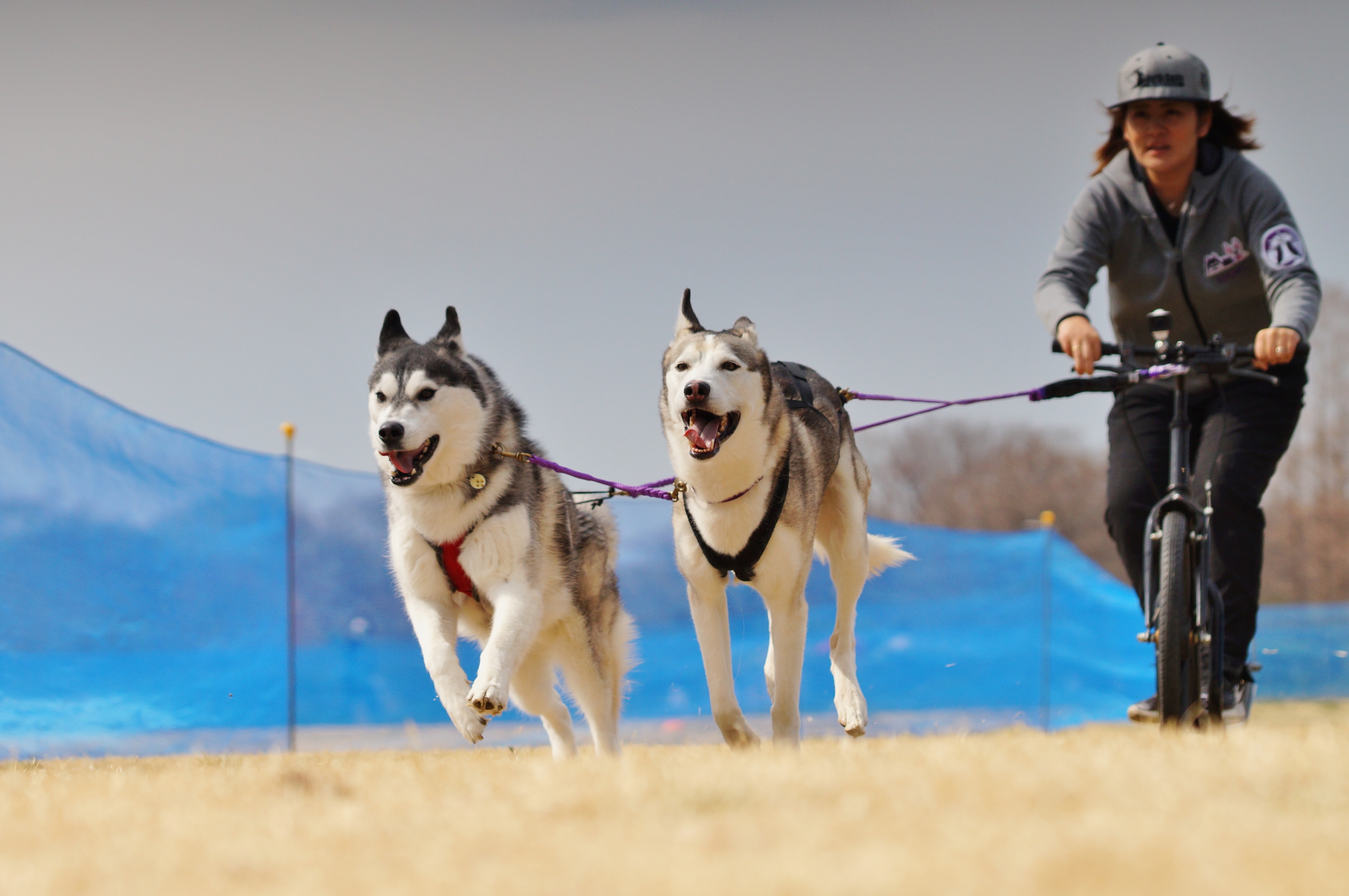 犬ぞり愛好家は、積雪が無い時期に自転車やカートを使って犬達を走らせて、犬の体作りをしています。