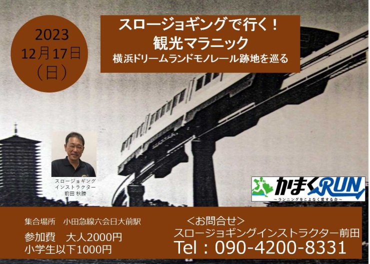 横浜ドリームランドが開園したのは1964年8月1日。そのあと1966年4月28日にドリーム交通がモノレールを開通したが、わずか1年半後の1967年9月24日に運航休止となる。全長約5.3km運行時間約8分であったモノレールは今では面影もありませんが、そのコースをゆっくり「スロージョギング」で巡ります。今では直に進めないところもありますので多少回り道をします。勾配の激しいコースですが、上り坂は歩いて進みます。スロージョギングは無理しないのが大前提です。