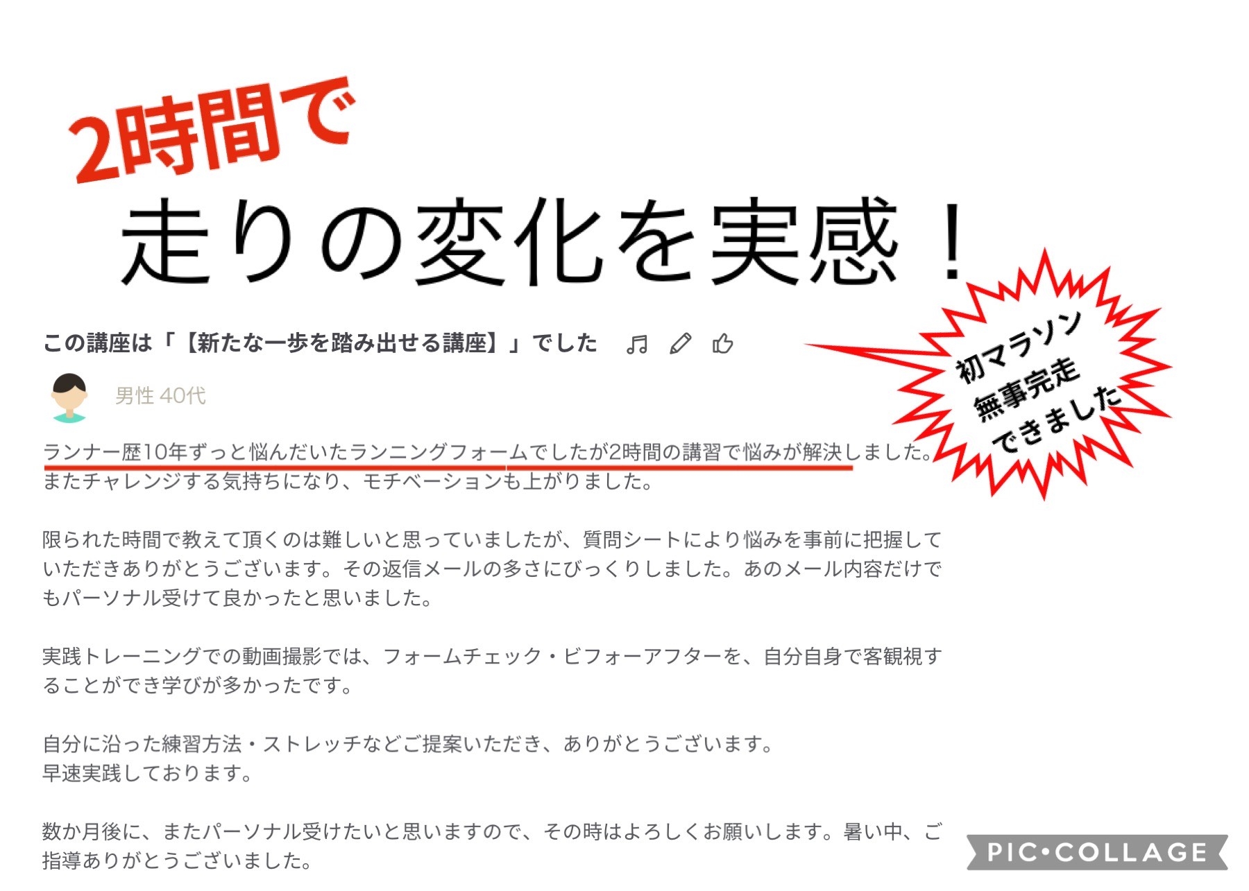 「東京マラソンで自己ベストを5分近く更新できました。 カイゼン受講後、低迷していたタイムが劇的に向上しております。」 (兵庫県伊丹市/40代男性)