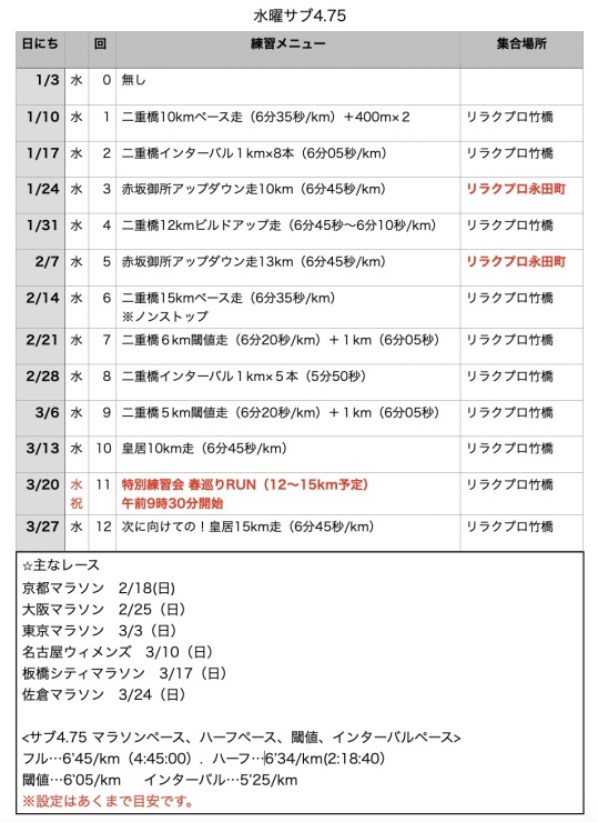 1〜3月毎週水曜日開催のフルマラソン4時間45切り(サブ4.75)を目指す方向けの練習会です。