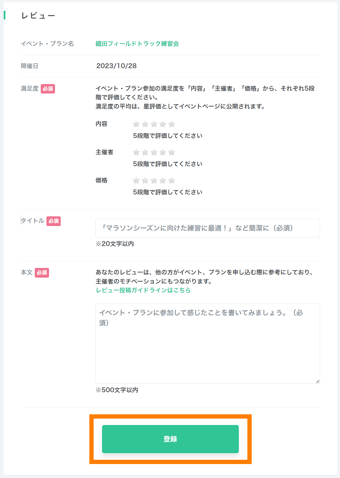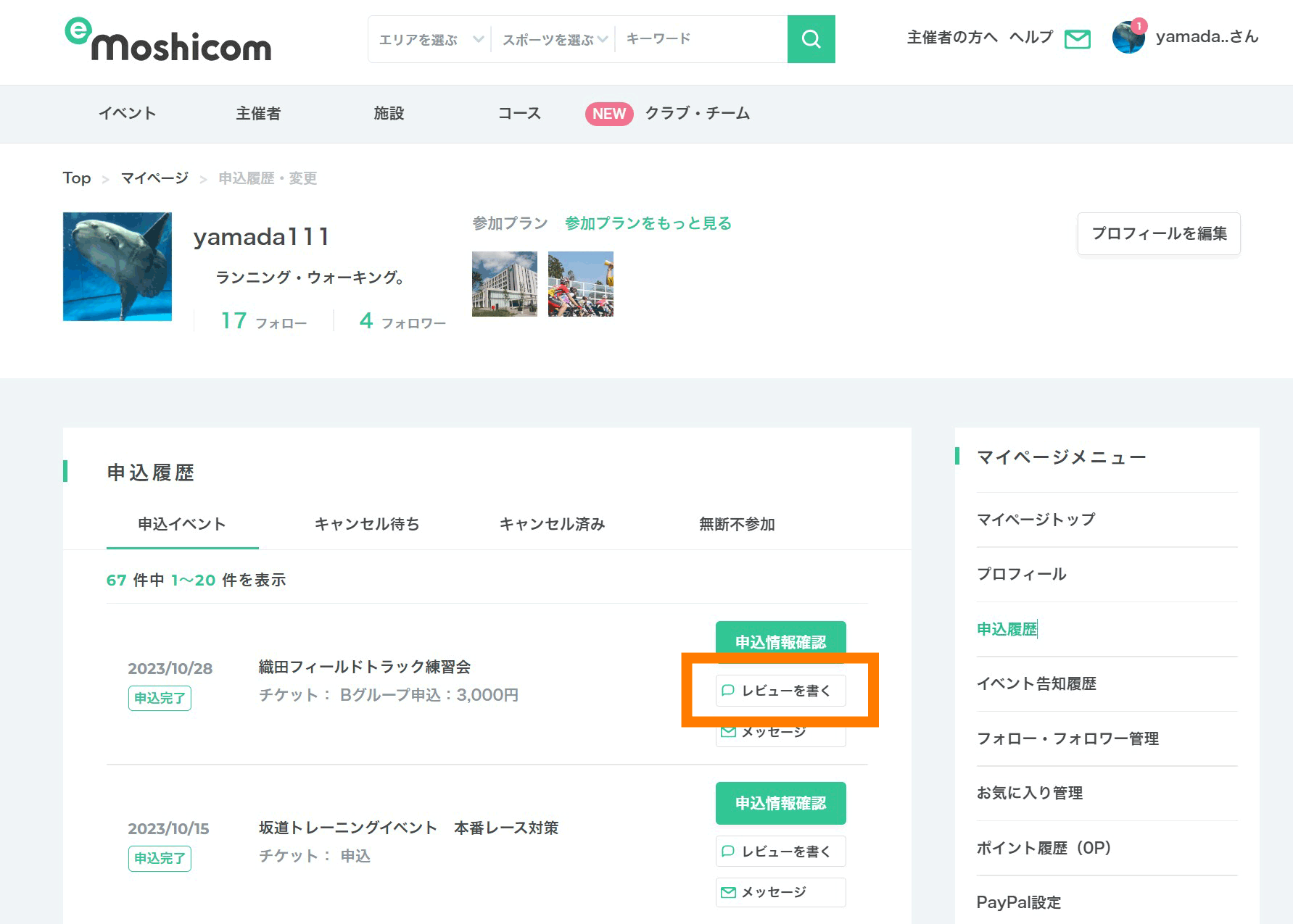 - マイページ「申し込み履歴」より、すでにご参加いただいているイベントのレビューを投稿してください。