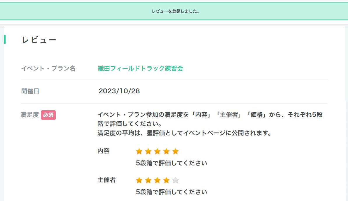 レビュー投稿完了すると、該当主催者ページにレビューが掲載されます。