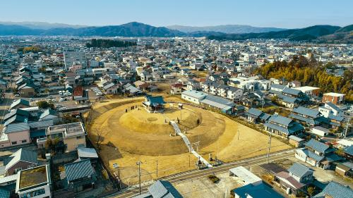 兜山古墳 兜山古墳は、鯖江台地北部の緩やかな東側斜面に立地する二段築成の大型円墳である。旧北陸道に面した八幡神社の社叢がそれであり、神社の社殿は墳頂上に建っている。墳丘全体が神社地となった結果、古墳が現在まで良好な状態で保存されてきた好例である。
