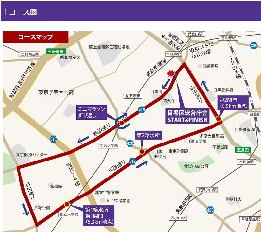 目黒シティランのコース。一周ほぼ10kmと距離を測りやすく、幹線道路だけど適度にアップダウンがあります。道中コンビニも多く補給しながらのロング走もできます。