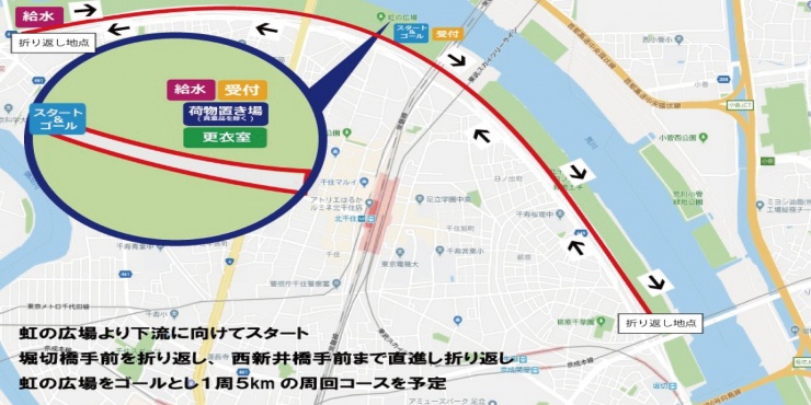 虹の広場からスタートし堀切橋を折り返し、虹の広場を直進。西新井橋折り返し、虹の広場をゴール(1周5km)周回コースを予定。詳細はイベント検索で「UPRUN」★関東近郊で毎週末開催中!★