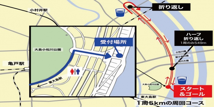 平井大橋までの片道2.5km。1周5kmの周回。※1週のみ549m※道中にトイレが5カ所あるのはお薦めポイントです。