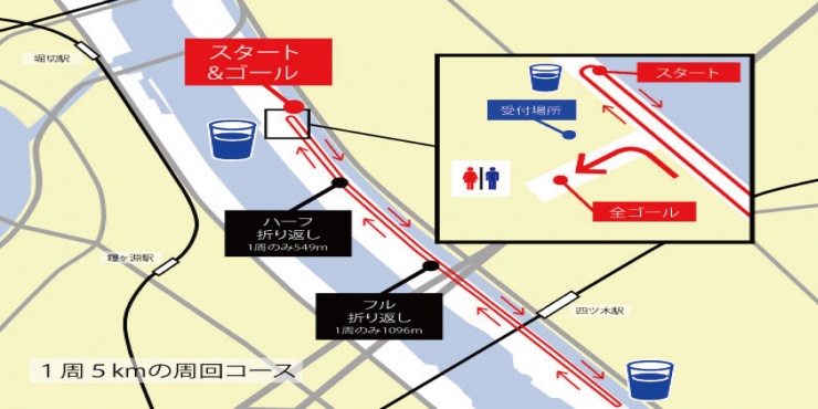 堀切橋河川敷〜荒川河川敷木根川橋少年野球場の片道2.5km、1周5kmの周回。※1周のみ549m