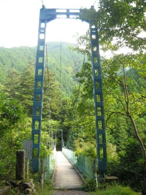 道所吊橋 しだくら橋と同じく橋の定員が5名である。多摩川にかかる最上流の吊橋である。完成から約30年が立つ。