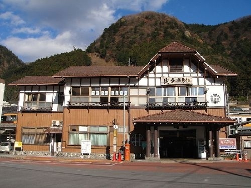 奥多摩駅 丸太造りの骨組み、急勾配の赤い屋根が美しい奥多摩駅は、青梅線の終着駅であり、東京都最西端の駅である。関東の駅百選にも認定されている。