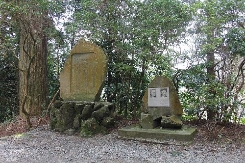 権現坂を下り、杉並木に入ったところにある大きな石碑です。大正時代に箱根に別荘を持っていたバーニー氏が建てたもので、江戸時代に来日し、初めて箱根を世界に紹介したケンペルの「日本誌」を引用して、箱根の自然を大切にしようと呼びかけたものです。脇には、箱根ゆかりの両者を顕彰した石碑が建てられています。