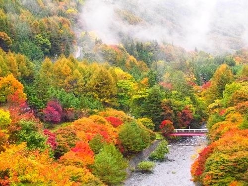 中央アルプス最北端、経ケ岳を源とする横川渓谷は、澄んだきれいな清流と春は眼にまぶしい新緑や、秋には各種の樹木から織り成す紅葉の色も様々です。国天然記念物の横川の蛇石は、粘板岩に変成岩の層が貫入してできた珍しい岩で、白いシマが長々と川底に横たわっている様は、まるで大蛇のような姿に見えることから蛇石と呼ばれています。三級の滝は、横川渓谷の原生林の中で50mの高さを三段に折れ曲がり落下する壮大な滝で、ものすごい水量でしぶきをあげています。かやぶきの館は、日本一の茅葺屋根です。