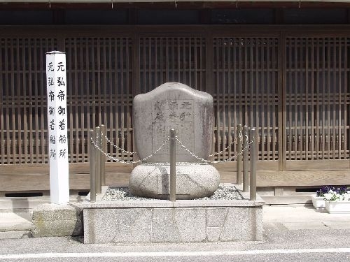 元弘帝御着船所の碑 お腰掛けの岩の南にあります。後醍醐天皇が御来屋に上陸されたとき、納屋に板戸を立ててしばらくの間天皇をかくまった家に、天皇は「ここはまるで鳥のねぐらのようだ」ということから「聯(ねぐら)家」という名前を下賜されました。後に鳥取藩がその功を賞して建てたとされる碑が、御来屋街道沿いに残っています。