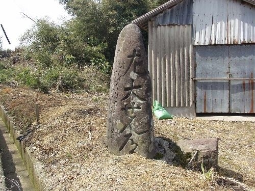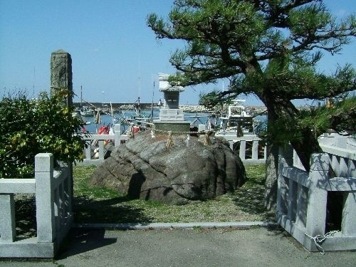 お腰掛けの岩 元弘3年(1333)に隠岐島を脱出された後醍醐天皇が、無事に名和湊(現在の御来屋港)に到着された際、しばらくの間お腰掛けになった岩と伝えられています。30年ほど前までは海の中にありましたが、漁港の改修により、そのままの位置で海面から1.4m持ち上げられて、現在では陸の上に位置しています。