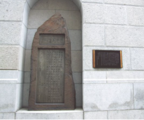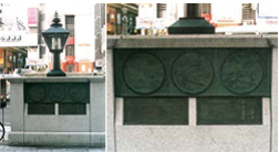 心斎橋は、元和8年(1622)ころ美濃屋岡田心斉が中心となって架けたところから名づけられたとされる。江戸時代の心斎橋は長さ18間(約35.5m)幅2間1尺(約4.2m)の木橋で、橋筋の人々が大切に維持管理する 「町橋」として近代までその生命を保った。文明開化の波にのって、明治6年(1873)、ドイツ直輸入の鉄製弓形トラス橋となった心斎橋は、橋脚なしに川をまたぐ当時としては珍しいもので、名所絵の絶好の題材となった。さらに明治42年(1909)石造2連アーチ橋に架け替えられ、眼鏡橋として川面に映るガス灯と共に長く親しまれた。新しい心斎橋では当時の面影を残すため、ガス灯を復元するとともに、欄干や親柱には建造時の石材をそのまま使用しており、顕彰碑は南側歩道の東側に設置されている。