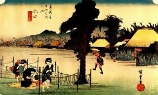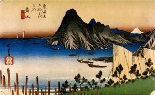 興津宿は薩埵峠と江尻の中間にあり、その昔、清見潟や清見ヶ崎などと呼ばれた名高い景勝地でした。東には薩埵山の端越しに富士を望み、西には三保の松原・久能山を望める海岸美を誇っています。古来より甲州と駿河を結ぶ交通の要衝でもあります。広重絵に描かれているのは、薩埵峠を越えた後に目の前に現れる興津川。今も昔も鮎釣りの名所として知られる清流です。
