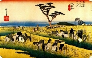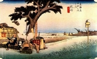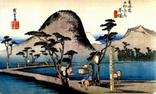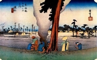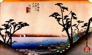 現在は海水浴場として名高い大磯。明治以降は避暑地となり、伊藤博文や岩崎弥之助、吉田茂らの別荘が建てられました。広重絵の画面左奥に見える松林の向こうに続く海岸は、万葉集や後撰和歌集にも詠まれた歌枕の地・小余綾の磯。現在も海岸沿いに、見事な松林が残されています。