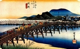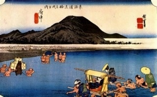 東海道一の大河、大井川を控えた島田宿は渡し場として発展した宿場です。大井川は「箱根八里は馬でも越すが越すに越されぬ大井川」の歌でも知られており、旅人にとってはなんとも厄介な難所でありました。