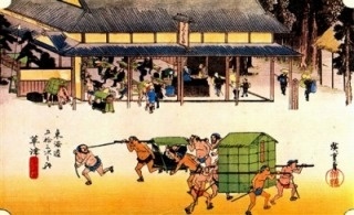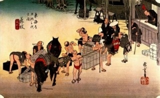 多くの人で賑わうことの商店街と同じく、江戸時代の宿場町・藤枝も、交通の要所として、また商業地として非常な賑わいを見せていました。広重絵では「問屋場」の様子が描かれています。