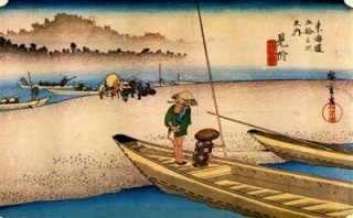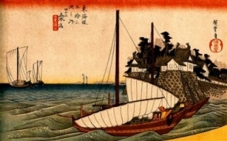 宮の宿から桑名までは、渡し船で約4時間の旅。「七里の渡し」とはいいながら、干潮時には沖合を通らねばならず、航路が10里近くになることもあったといいます。