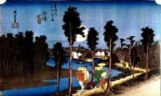 一方で、広大な湿地帯の向こうにそびえる富士の姿は、往来する旅人を喜ばせました。次の吉原宿へ向かう途中には、百人一首に登場する田子の浦の海岸もあります。