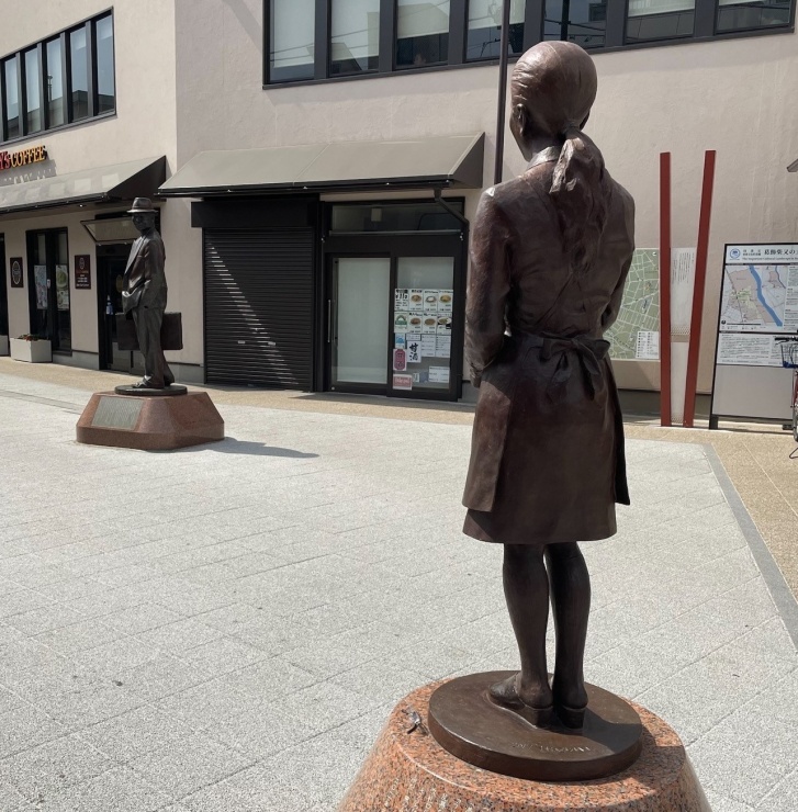 「旅に出る寅さんが、さくらの方を振り返ったシーン」をモチーフとした寅さんの銅像です。1999年に地元商店会と観光客の募金によって、柴又駅前に建てられました。銅像の足元には、山田洋次監督による寅さんの故郷への思いが刻まれています。2017年に、寅さんを見送る妹さくらの銅像も建立されました。