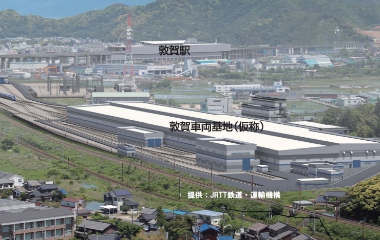 敦賀車両基地 0km地点、敦賀車両基地。 敦賀駅からさらに南に進んだ敦賀車両基地では、新幹線車両の夜間の滞泊や折返し列車の待機などのほか、車両の点検も行われます。