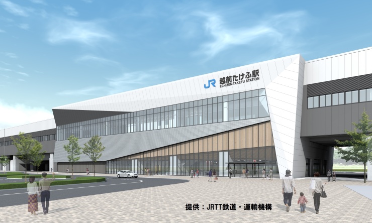 北陸新幹線越前たけふ駅 32.5km地点。今回の開業区間で唯一の新幹線単独駅。 「伝統、文化を未来につなぐシンボルとしての駅」がデザインコンセプト。