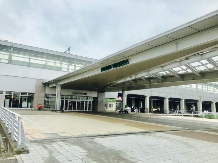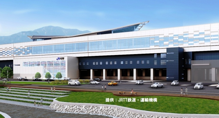 北陸新幹線小松駅 100.4km地点、小松駅。 イメージは雪をまとった霊峰白山の山並み。「慣れ親しんだ白山の雄大な山並みと未来を感じるターミナル」がデザインコンセプト。