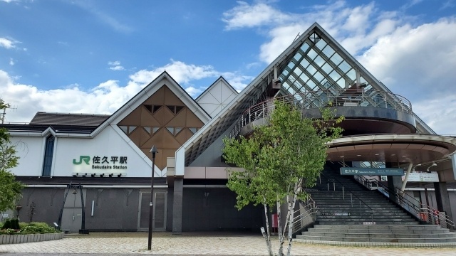 北陸新幹線佐久平駅 413.6km地点、佐久平駅。 新幹線ホーム上に橋上駅舎を有する。駅舎には、近くの旧中込学校をモチーフに重厚感ある白壁やステンドグラス風のガラスが使用されているほか、周囲の山並みを表現するとして三角屋根が取りつけられている。