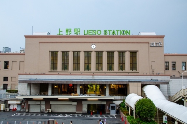 上野駅 577.7km地点、上野駅。 1883年に日本鉄道の駅として開業。多数の在来線や新幹線、地下鉄路線が乗り入れる。1927年に開業した東京地下鉄道(現在の東京メトロ銀座線)上野駅 - 浅草駅間は東洋初の本格的な地下鉄路線として知られる。