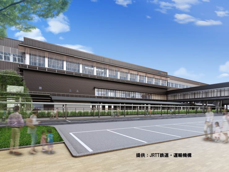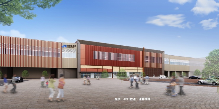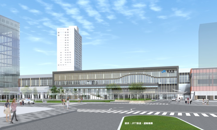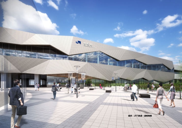 北陸新幹線敦賀駅 2km地点、2024年春の北陸新幹線開業時の終着駅、敦賀駅。 「空にうかぶ~自然に囲まれ、港を望む駅~」がデザインコンセプト。