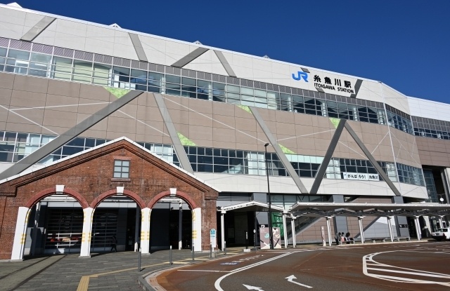 北陸新幹線糸魚川駅 259.1km地点、糸魚川駅。 イメージは日本海と北アルプスに抱かれた雄大な自然を感じさせる駅。「日本海、北アルプス、ヒスイをシンボルにして」がデザインコンセプト。