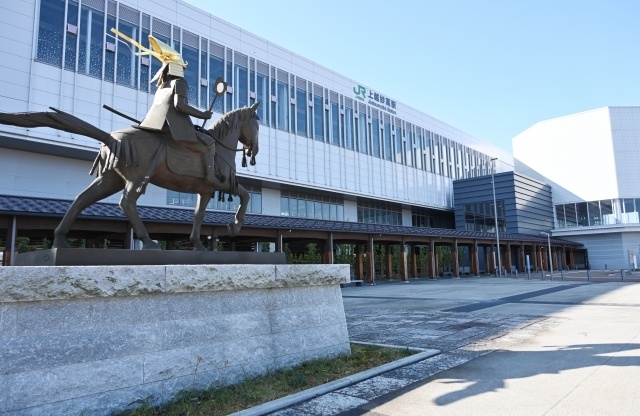 北陸新幹線上越妙高駅 296km地点、上越妙高駅。 イメージは「さくらと雪の平原」~心地よい軽やかさと繊細さ~。「記憶に残る駅」がデザインコンセプト。 駅前には上杉謙信像が建つ。