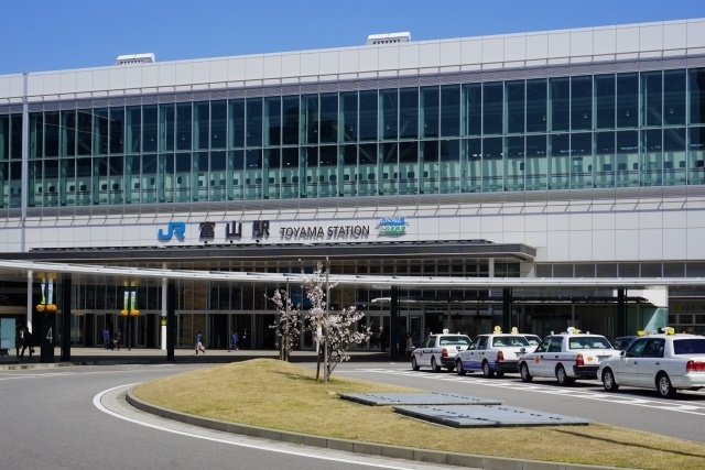 北陸新幹線富山駅 186km地点、富山駅。 イメージは静謐な雪にたたずむ木立の駅。「立山あおぎ 心ときめく 光の舞台」がデザインコンセプト。
