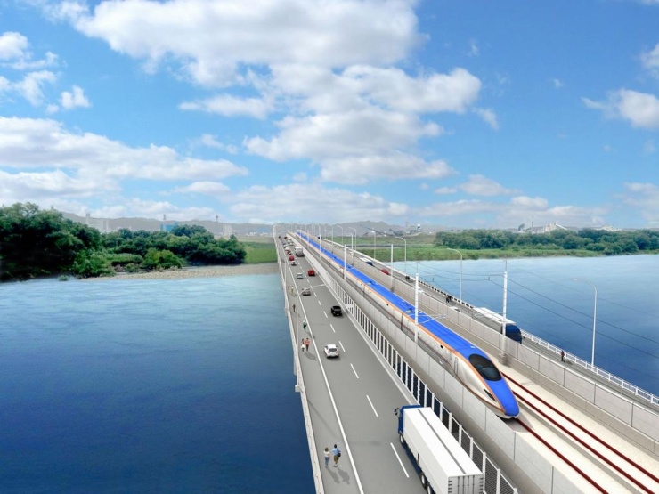 新九頭竜橋 57.3km地点、新九頭竜橋。 一級河川九頭竜川を渡る橋長414mのPC箱桁橋で、新幹線では初めてとなる鉄道・道路一体橋りょうです。