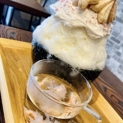 ふわふわのかき氷が冷やした石の器で提供されます。
