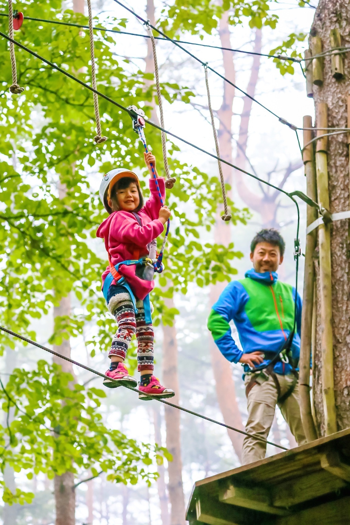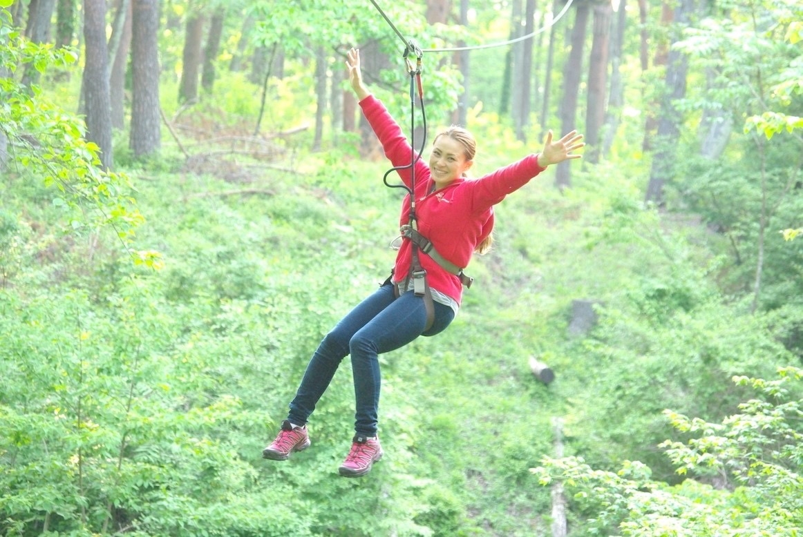ハーネスを装着し、木に登り、木から木へ渡り歩き、最後は空中散歩のように地上まで滑ります。