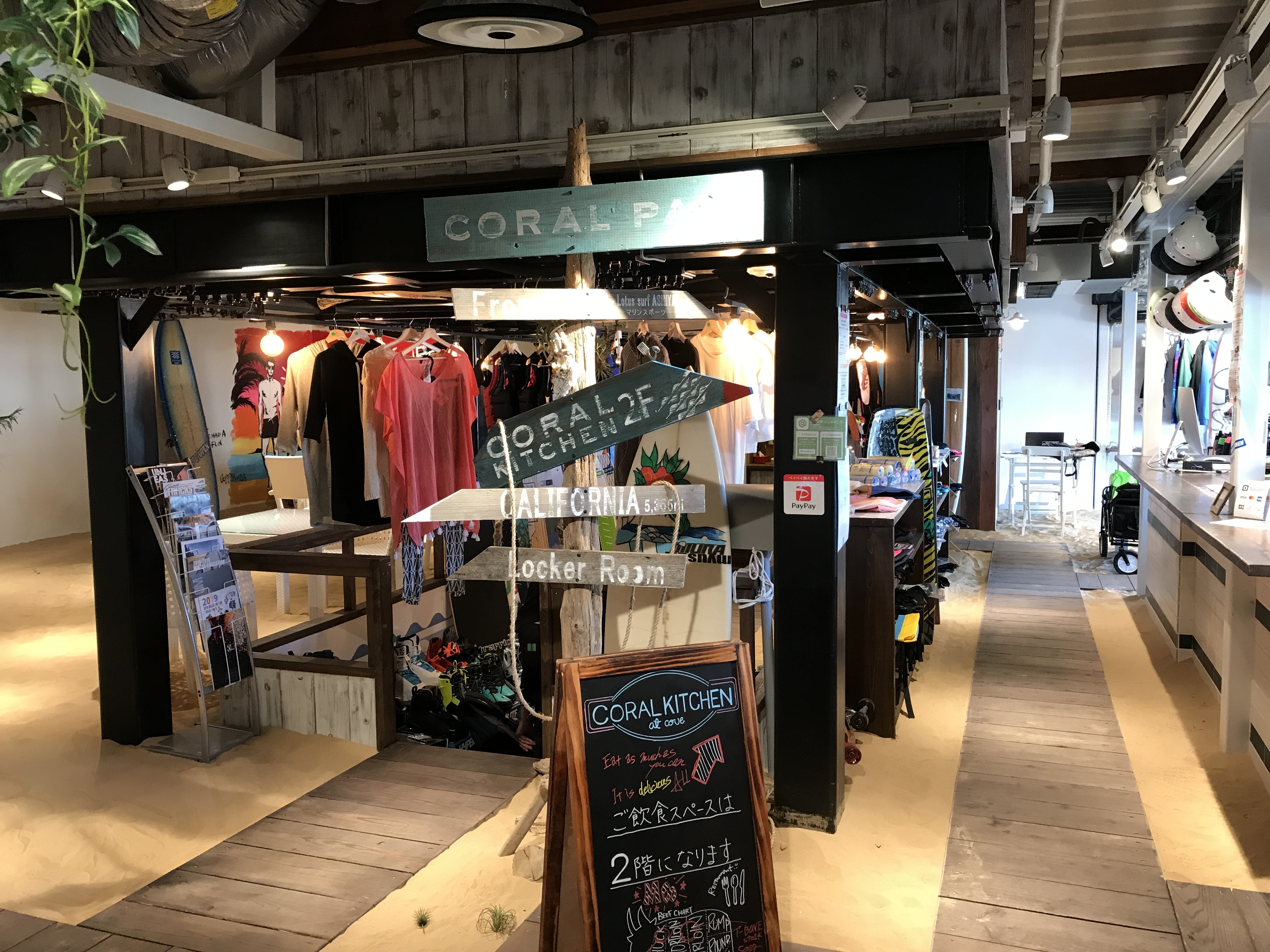 CORAL KITCHEN at cove1階にコーラルパーク総合受付とサーフショップが併設。店内には天然のビーチの砂を引き詰めた仮想ビーチはフォト映え間違いなし!シャワールームや各種レンタル品も完備!初めての方でも手ぶらで気軽にマリン体験ができます。ショップでは、ウエイクボードやサーフボード&ウェア&関連グッズを多数ラインアップしていますので、お気に入りのアイテムが見つかるかも!リゾート感たっぷりのフードやドリンクのテイクアウトメニューもご用意しています。