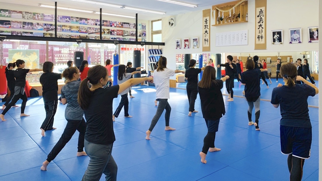 - 75畳の青畳に正面は鏡張り、南側と東側は総ガラス張りで、とても明るく天井高が4mもある開放感あふれる道場です。