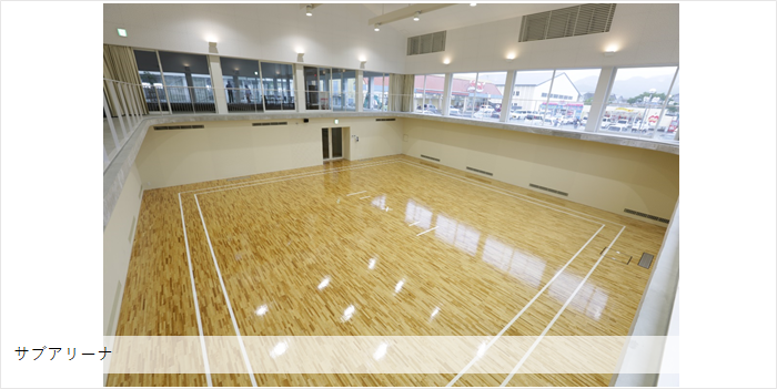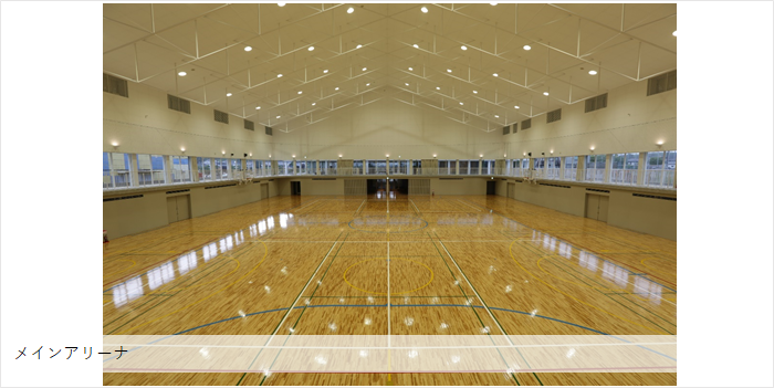 バスケットコート…2面、バドミントンコート…6面、バレーコート…2面(センターコート1面可)、放送設備、冷暖房完備